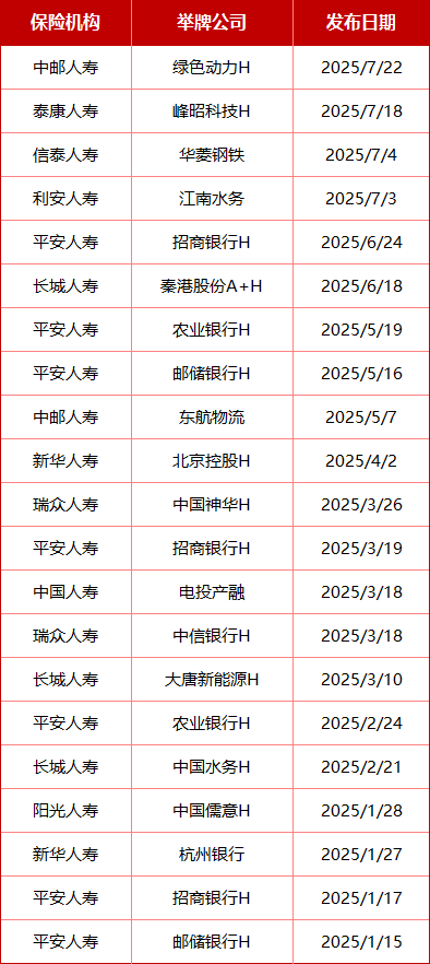 2025年举牌的险企包括平安人寿、瑞众人寿、长城人寿、新华保险、中国人寿、中邮人寿、阳光人寿等,举牌险企数量较多,且部分险企在首次举牌后继续增持。