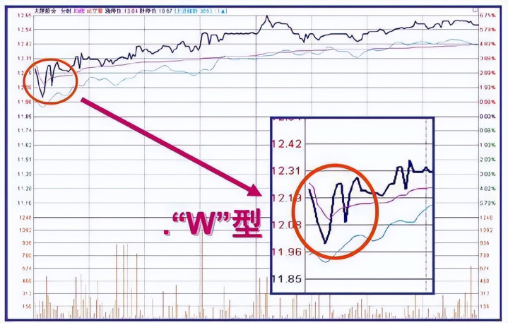 B.“W”型走势:与“N”字型走势类似——只是多了一次探底,在分时形态上形成一个“W”形走势。
