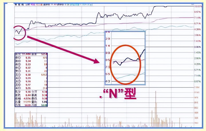 A.“N”型走势:即开盘后股价快速上冲后又快速回落,随即又快速上冲,分时图上呈现一个“N”字型走势——说明开盘后股价遭遇抛压,但随即又被买盘托起,显示多头力道强大。