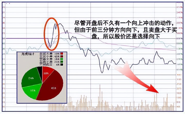 此种开盘没有方向性提示,关键看头一笔大单交易的方向:第一笔是买盘,并且连续在三分钟内买盘大于卖盘,全天方向向上;反之,则向下。