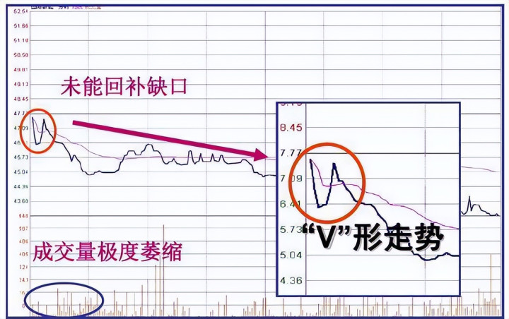 即低开后股价继续低走,或快速上冲到缺口附近再次回落,没能回补缺口,形成一个“V”形或倒“V”形走势,成交量呈现极度萎缩或极度放大之势,内盘是外盘的一倍以上,说明股价运行到顶部了。
