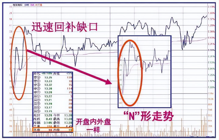 即低开后股价快速上冲到缺口附近,稍有回落后又快速上攻以回补缺口,分时图上也呈现一个“N”字型或“W”走势。